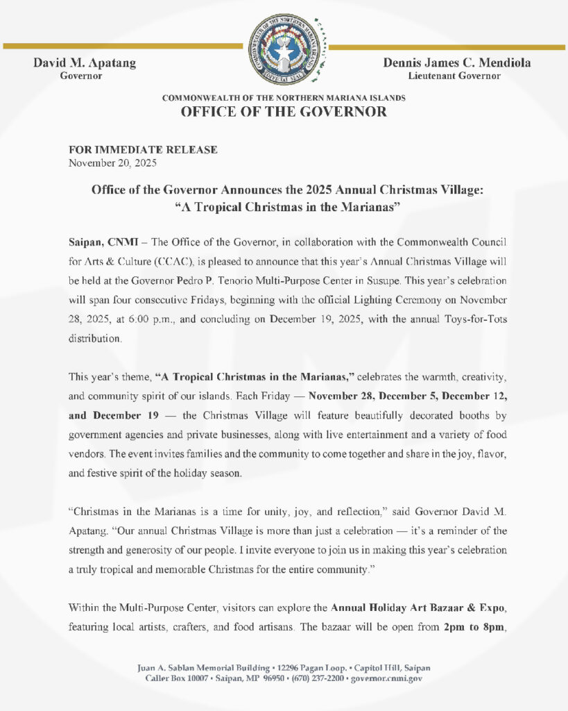 This year’s theme highlights the warmth and creativity of the islands, with decorated booths from government agencies and private businesses, live performances, and a variety of food options for families to enjoy. “Our annual Christmas Village is more than just a celebration, it’s a reminder of the strength and generosity of our people,” said Gov. David M. Apatang, inviting residents to help make this year’s event “a truly tropical and memorable Christmas for the entire community.”