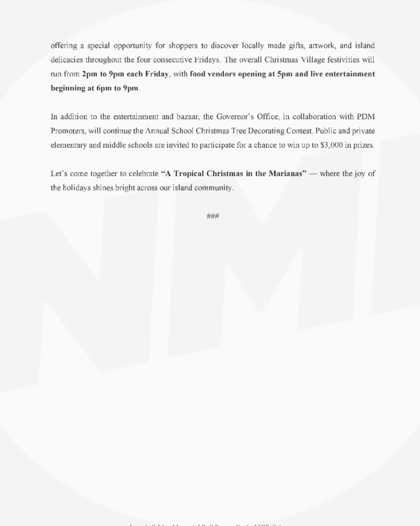 Officials are encouraging families across the islands to join the Christmas Village and “A Tropical Christmas in the Marianas,” celebrating the season with lights, music, food, and community spirit.
