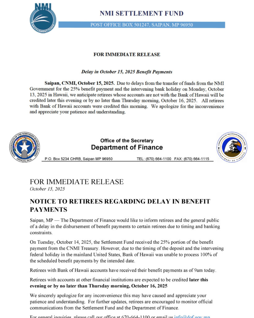 SAIPAN — The NMI Settlement Fund and the Department of Finance said some retiree benefit payments scheduled for October 15 were delayed due to the timing of a 25% transfer from the CNMI Treasury and an intervening U.S. federal bank holiday.