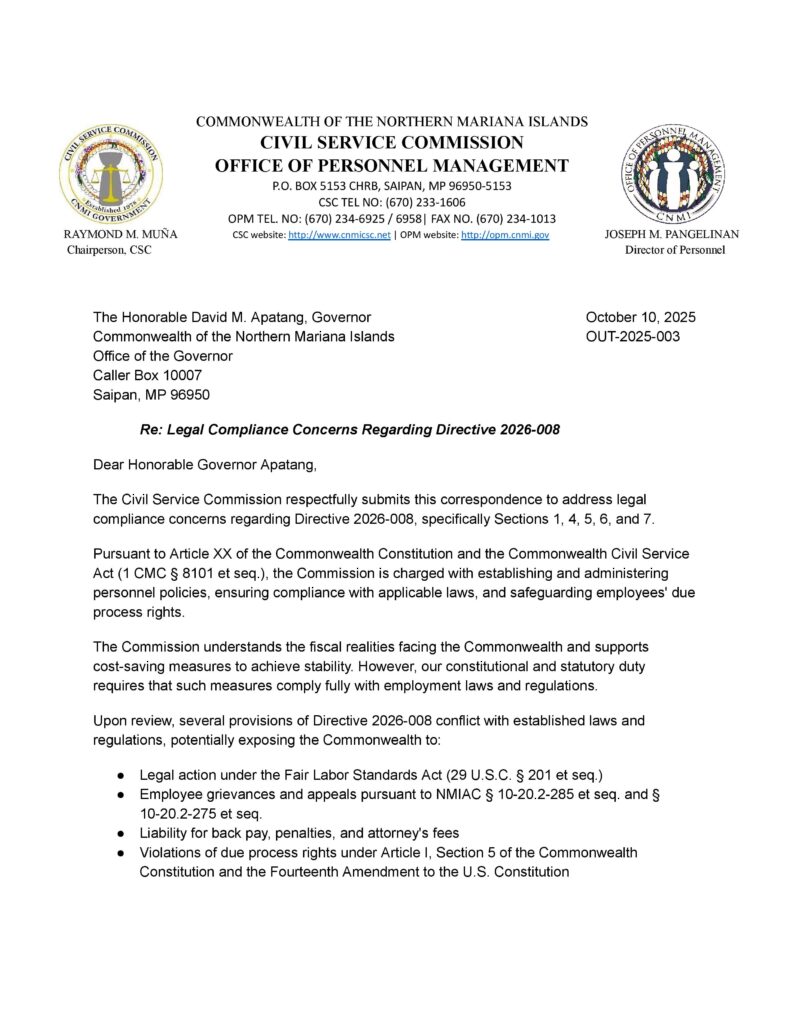 SAIPAN – As the administration and Legislature work toward a revised budget, and how any austerity measures will hit government employees, the Civil Service Commission has weighed in to warn Governor David M. Apatang that Directive 2026-008, the administration’s austerity plan, conflicts with CNMI and federal law in several areas and could trigger grievances, back pay, penalties, and due-process challenges unless corrected. In an Oct. 10 letter (OUT-2025-003) signed by CSC Chair Raymond M. Muña, the Commission says multiple sections of the directive require legal and procedural changes to comply with statutes, regulations, and the Fair Labor Standards Act (FLSA).