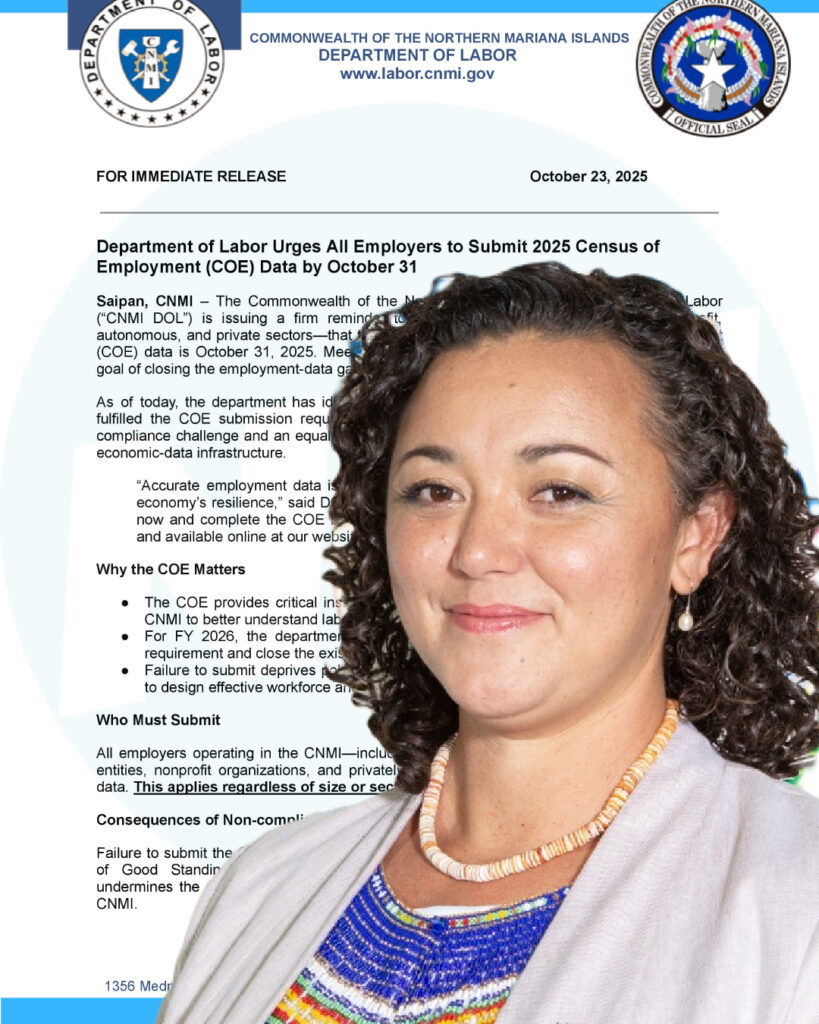 SAIPAN — The CNMI Department of Labor is reminding all government, autonomous agencies, nonprofits, and private businesses to submit 2025 Census of Employment (COE) data by Thursday, Oct. 31. DOL says roughly 2,400 businesses have not filed and warns that missing the deadline may lead to follow-up enforcement actions and denial of Good Standing Certifications.