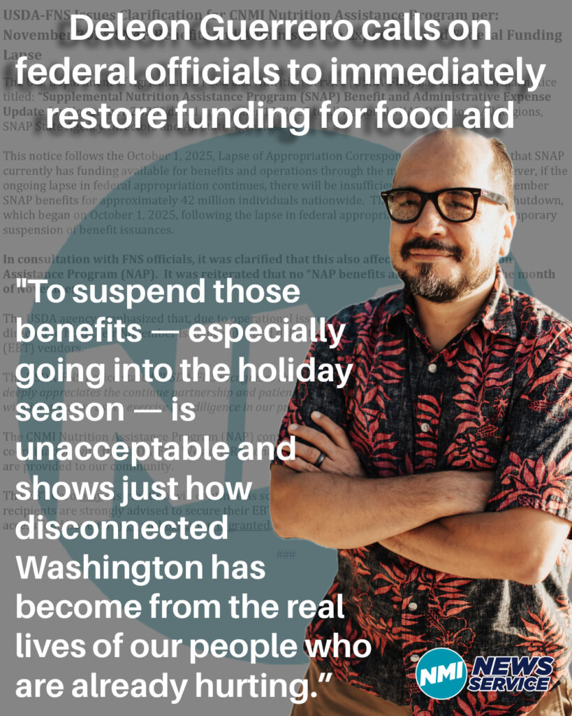 SAIPAN — Independent U.S. House candidate Galvin Sablan Deleon Guerrero is calling on federal officials to immediately restore funding for food aid in the Commonwealth after the U.S. Department of Agriculture ordered the CNMI Nutrition Assistance Program (NAP) to suspend November benefits because of the ongoing federal shutdown. Millions of low-income households in the 50 states and territories are at risk of losing access to food assistance next month as the shutdown drags on and USDA says it will not draw on emergency funds to cover November aid.