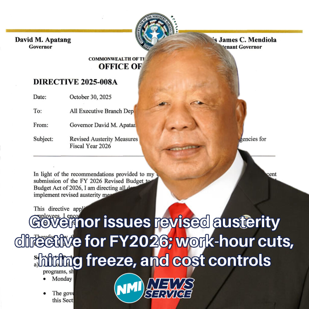 SAIPAN — Governor David M. Apatang issued Directive 2025-008A revising austerity measures for FY2026, ordering reduced work hours, a government-wide hiring freeze, and strict limits on overtime, travel, utilities, and other operating costs across executive branch departments and agencies. The order cites Public Law 24-14 and sets immediate compliance requirements for managers and employees.