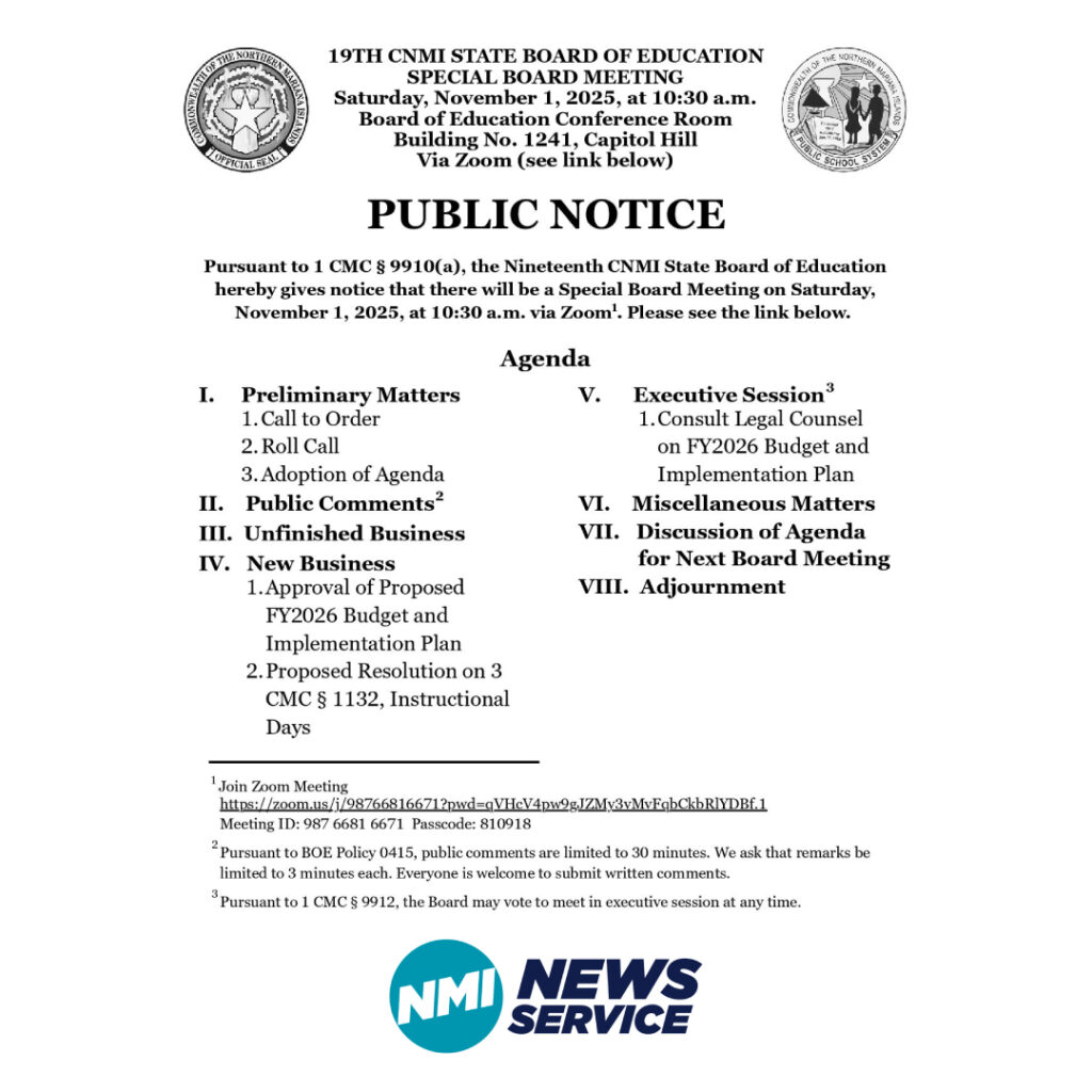 SAIPAN — The Nineteenth CNMI State Board of Education will hold a special board meeting on Saturday, Nov. 1, 2025, at 10:30 a.m. at the Board of Education Conference Room, Building No. 1241, Capitol Hill, with participation available via Zoom.