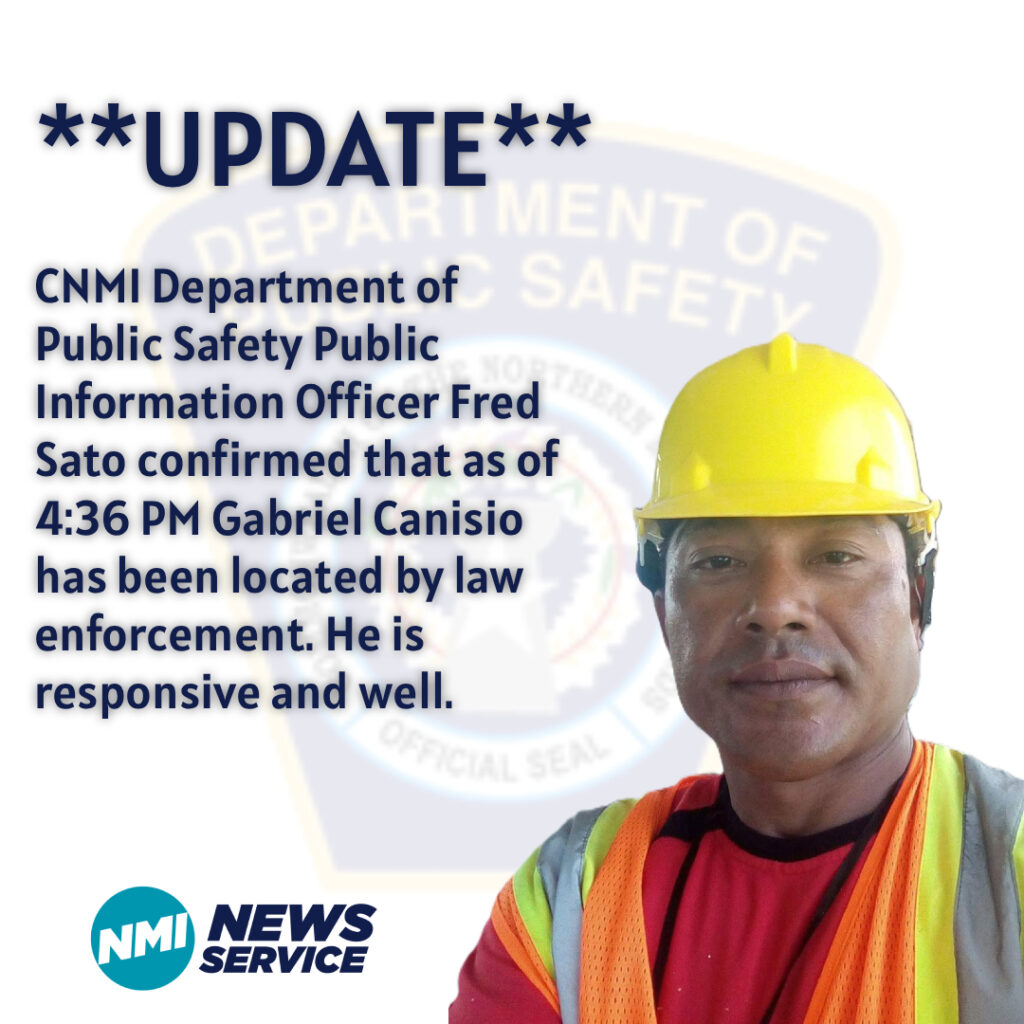 SAIPAN — CNMI Department of Public Safety Public Information Officer Fred Sato confirmed that at 4:36 p.m. today, Gabriel Canisio was located by law enforcement. He is responsive and well, Sato said. Further details were not immediately available.