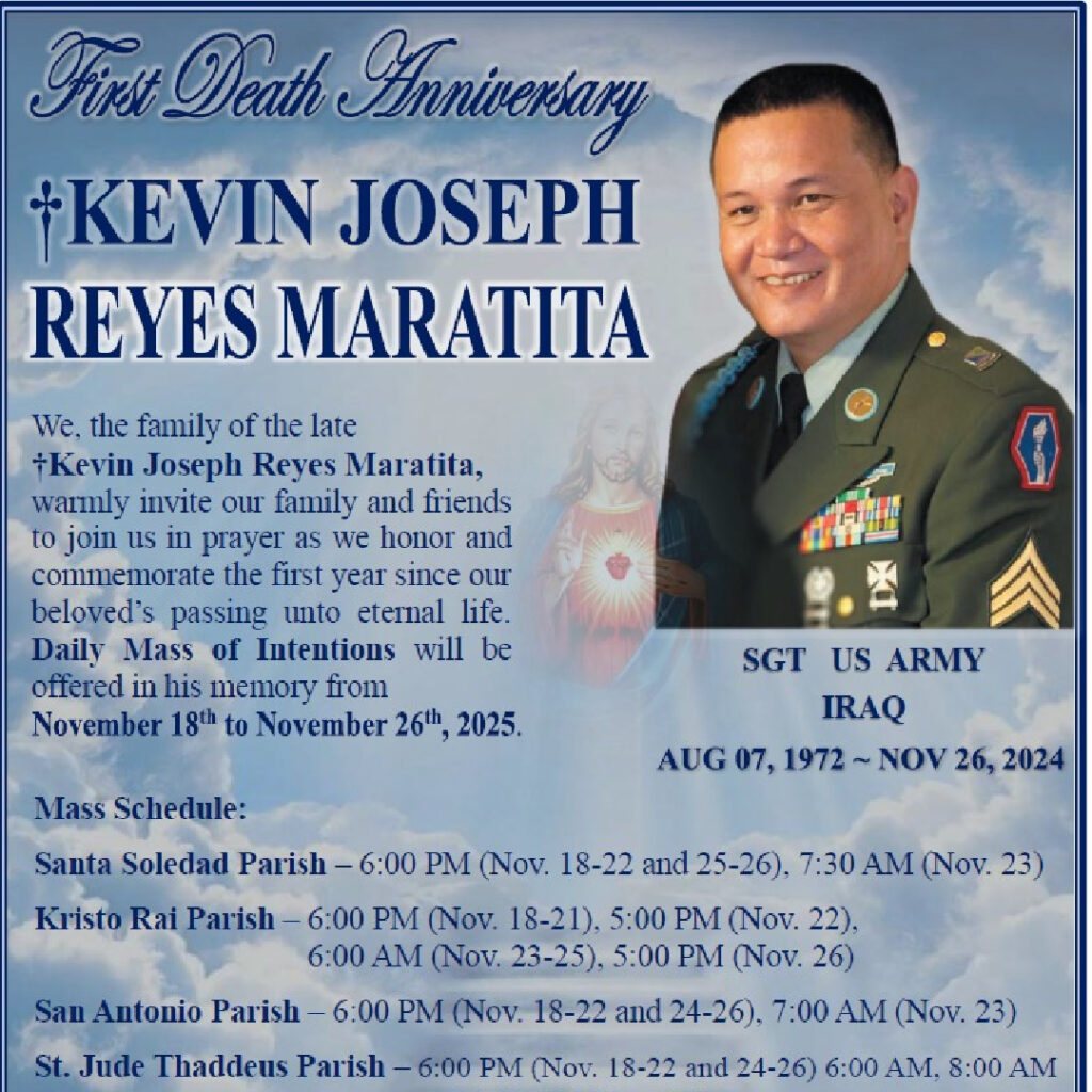 Sgt. Kevin Joseph Reyes Maratita’s family is inviting relatives and friends to join them in prayer as they mark his first death anniversary.