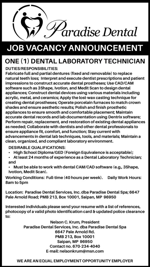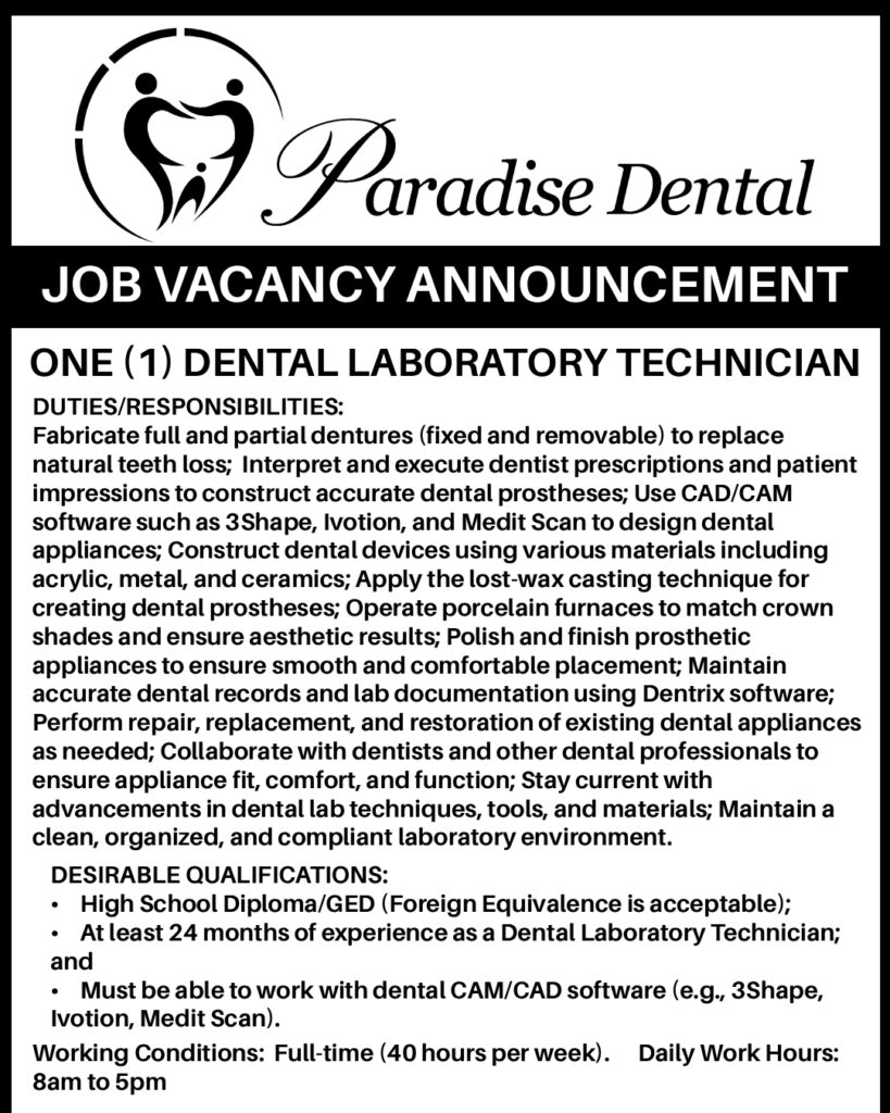 ONE (1) DENTAL LABORATORY TECHNICIAN