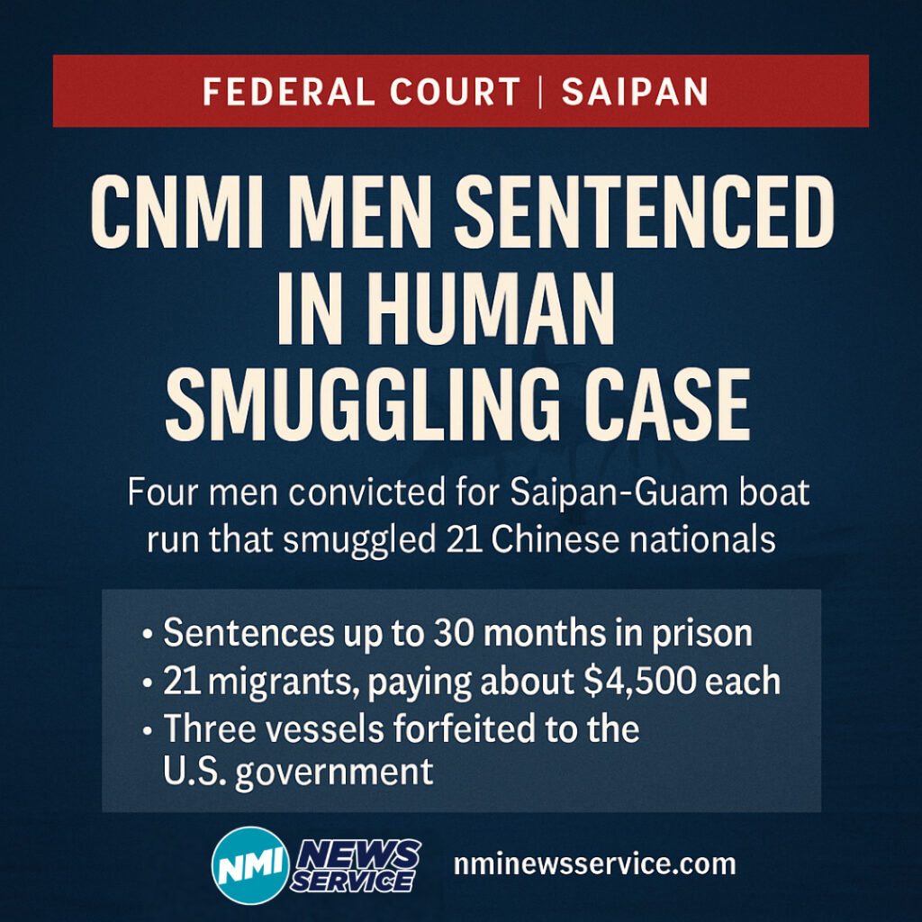 SAIPAN — Four CNMI men have been sentenced in federal court for their roles in a human smuggling operation that transported 21 Chinese nationals by boat from Saipan to Guam in June 2023.