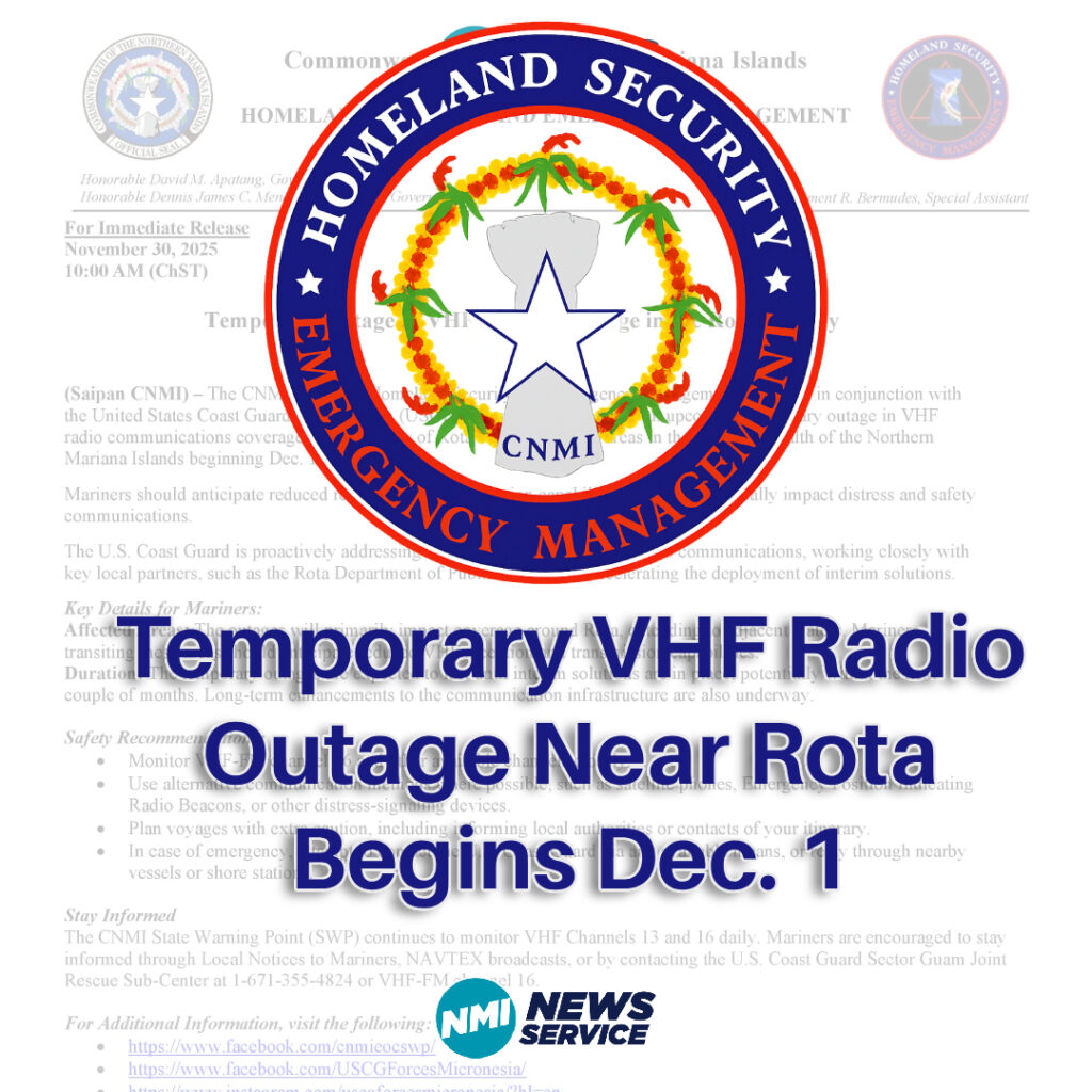 SAIPAN — The CNMI Office of Homeland Security and Emergency Management, working with the U.S. Coast Guard Sector Guam, is urging mariners to prepare for a temporary outage in VHF radio communications coverage in the vicinity of Rota and surrounding waters beginning Dec. 1, 2025.