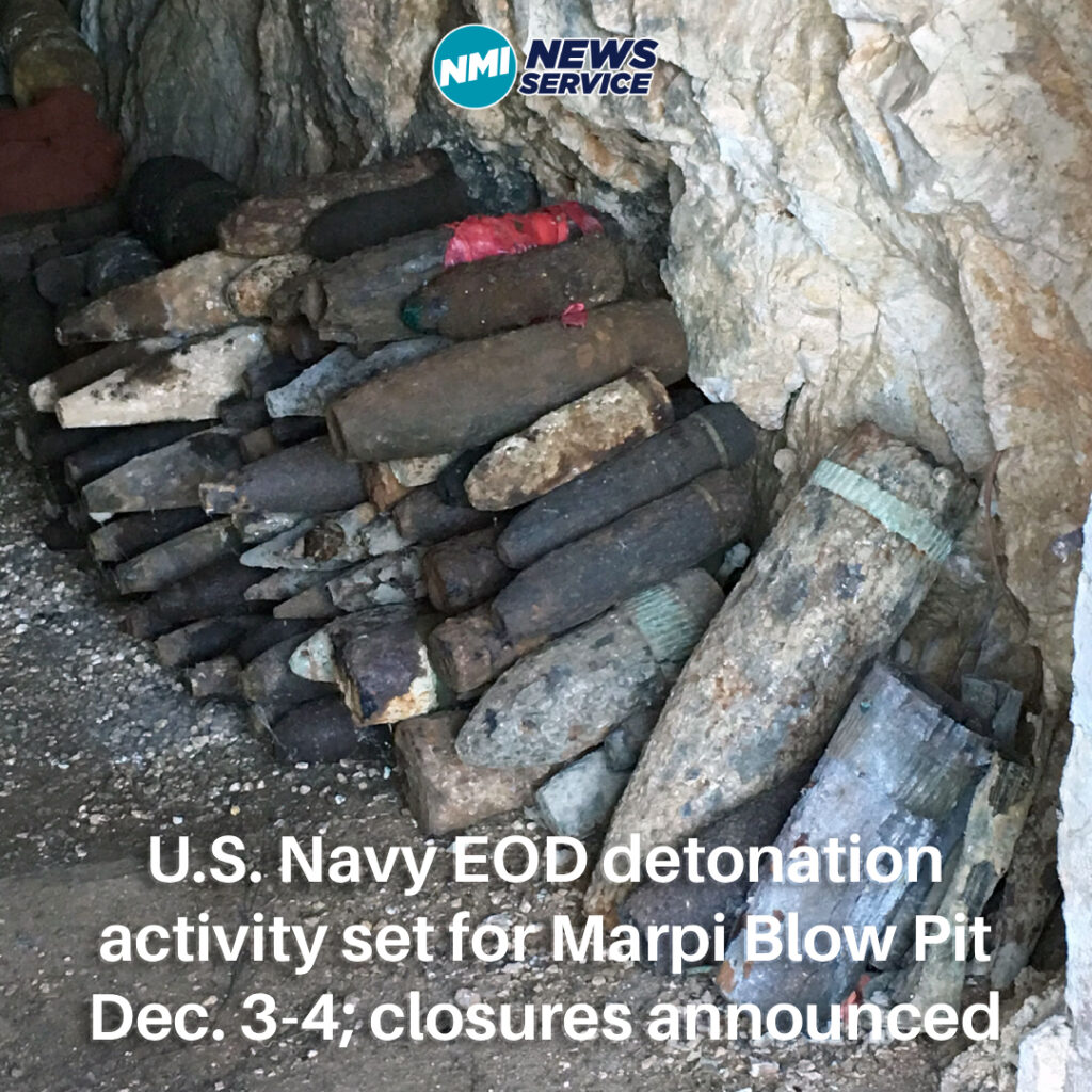 SAIPAN — The CNMI Emergency Operations Center-State Warning Point and the Office of the Governor’s Homeland Security and Emergency Management office issued an area advisory announcing scheduled detonation activity by the U.S. Navy Explosive Ordnance Disposal (EOD) Detachment Marianas at Saipan’s Marpi Blow Pit on Dec. 3 and Dec. 4.