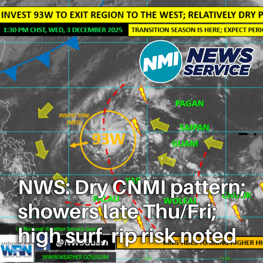 SAIPAN — The National Weather Service in Guam says the CNMI can expect a fairly dry pattern with moderate to fresh trade winds (15 to 20 mph) and only a few showers, according to its Weekly Regional Weather Outlook issued Wednesday, Dec. 3, 2025.