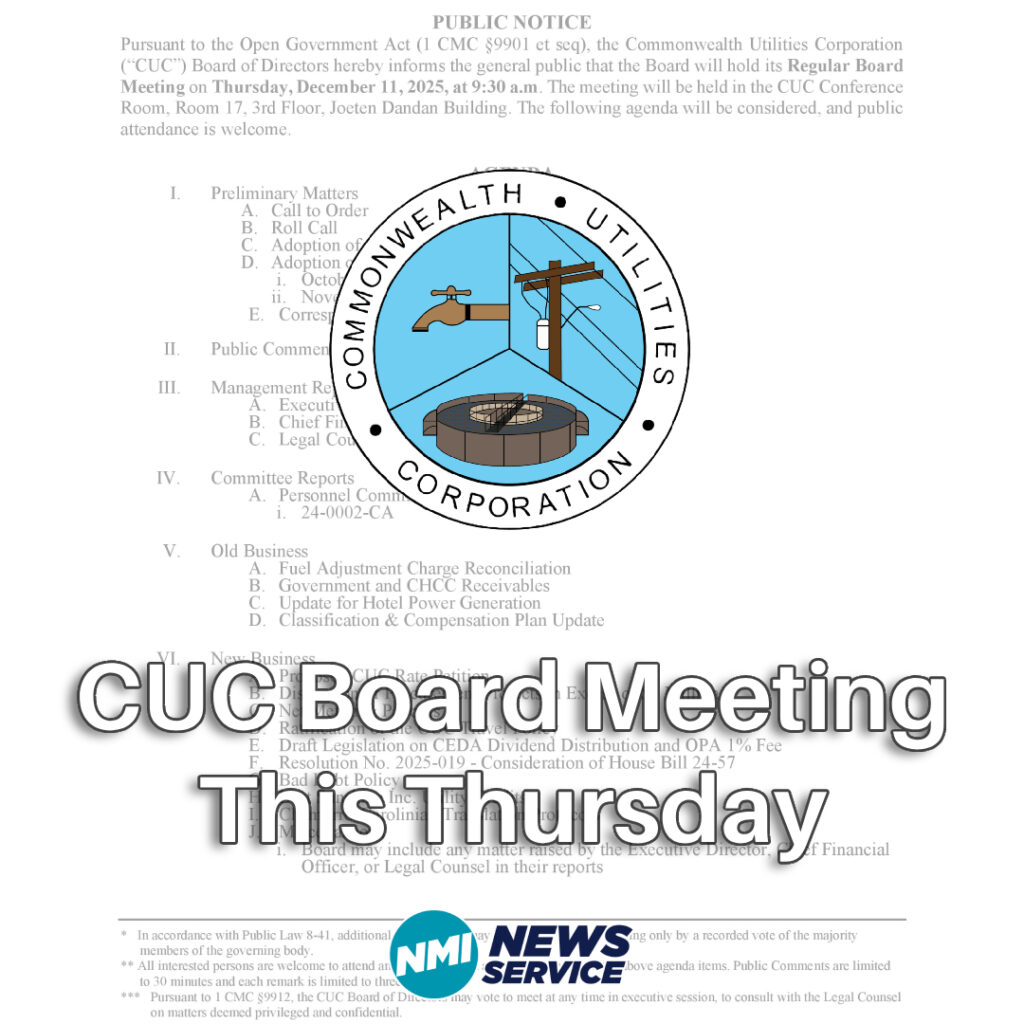 SAIPAN — The Commonwealth Utilities Corporation (CUC) Board of Directors will hold its Regular Board Meeting this Thursday, December 11, at 9:30 a.m. in the CUC Conference Room on the 3rd Floor of the Joeten Dandan Building.