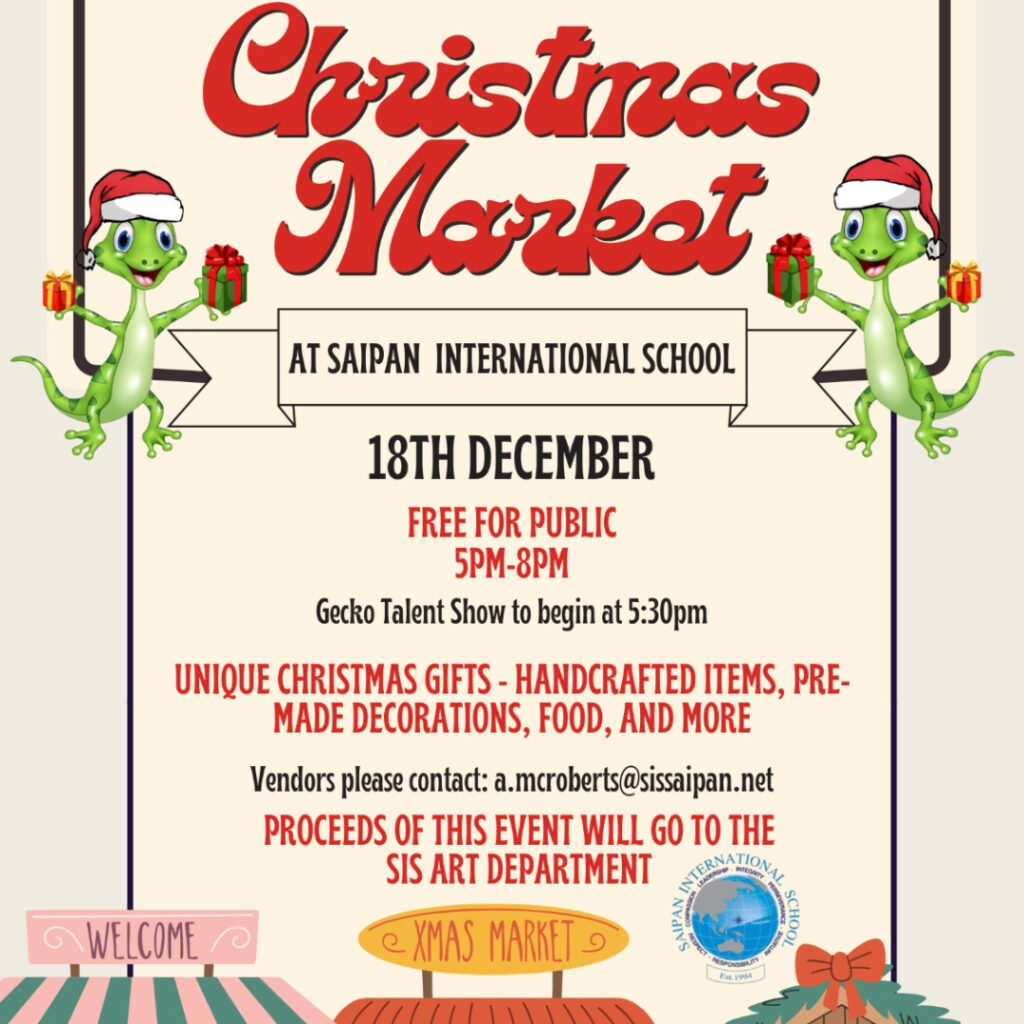 Saipan International School is hosting a Christmas Market on Dec. 18 — free to the public from 5 p.m. to 8 p.m. A Gecko Talent Show begins at 5:30 p.m. Expect unique Christmas gifts, handcrafted items, pre-made decorations, food, and more — with proceeds going to the SIS Art Department. Vendors can contact a.mcroberts@sissaipan.net