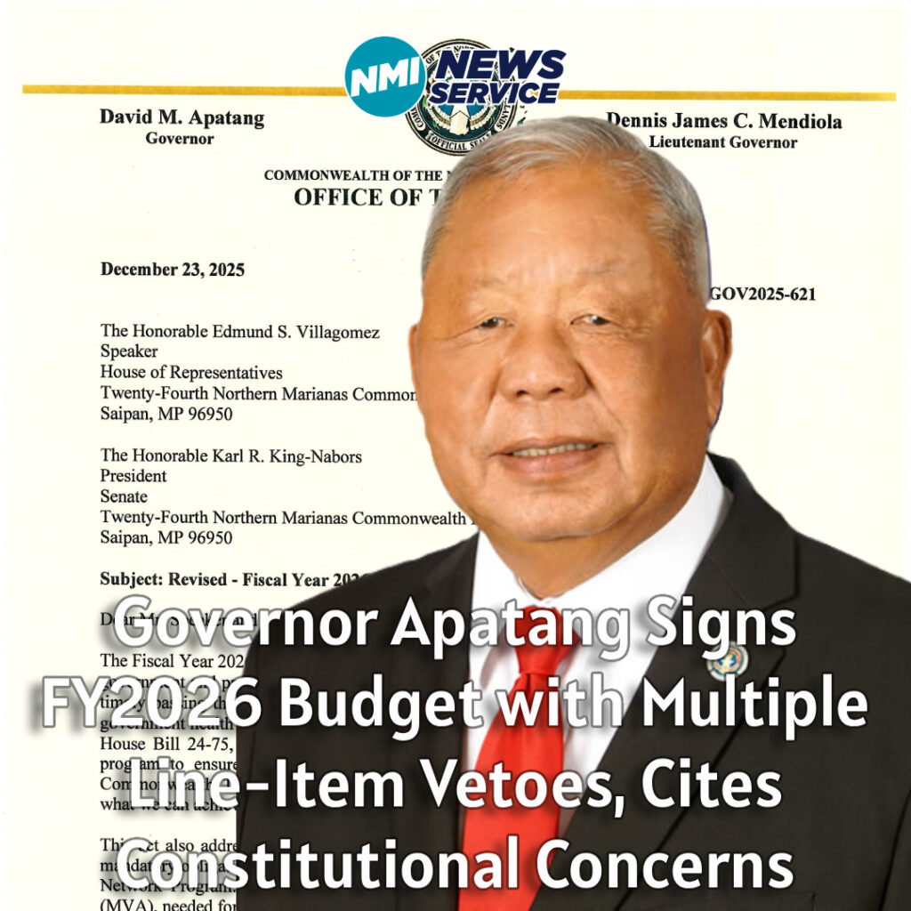 SAIPAN – Governor David M. Apatang has signed the Commonwealth of the Northern Mariana Islands’ Fiscal Year 2026 Appropriations Act into law as Public Law 24-20, while exercising his line-item veto authority on multiple provisions he deemed unconstitutional or financially imprudent.