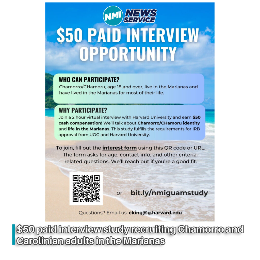 SAIPAN — Chelsea King, a doctoral student at Harvard University, is recruiting participants for her dissertation research and will conduct two-hour virtual interviews focused on Chamorro and Carolinian identity and life in the Marianas.