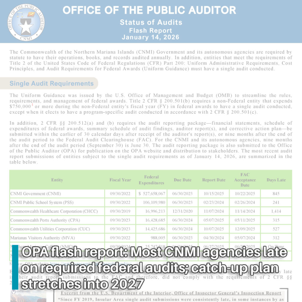 SAIPAN — The Office of the Public Auditor says the CNMI government and several autonomous agencies have been significantly late in submitting required single audit reports tied to federal funding, a pattern the office warns can trigger serious federal consequences if not corrected.
