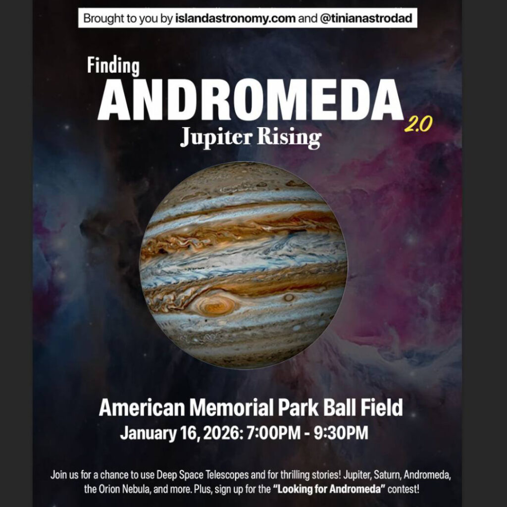 SAIPAN – A public astronomy observation and outreach event entitled “Finding Andromeda 2.0: Jupiter Rising” is set for Friday, January 16, at the American Memorial Park ball field, hosted by Island Astronomy in collaboration with Tinian Astro Dad.