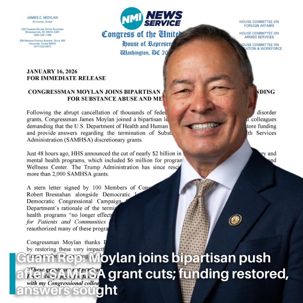 HAGATNA, Guam — Congressman James Moylan said he joined a bipartisan letter with 99 other members of Congress urging the U.S. Department of Health and Human Services to immediately restore funding and explain the termination of Substance Abuse and Mental Health Services Administration discretionary grants after what the release described as an abrupt wave of cancellations nationwide.