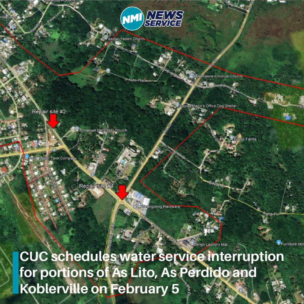 SAIPAN — The Commonwealth Utilities Corporation has announced a scheduled water service interruption for portions of As Lito, As Perdido and Koblerville on Thursday, February 5, from 9 a.m. to 4:30 p.m.