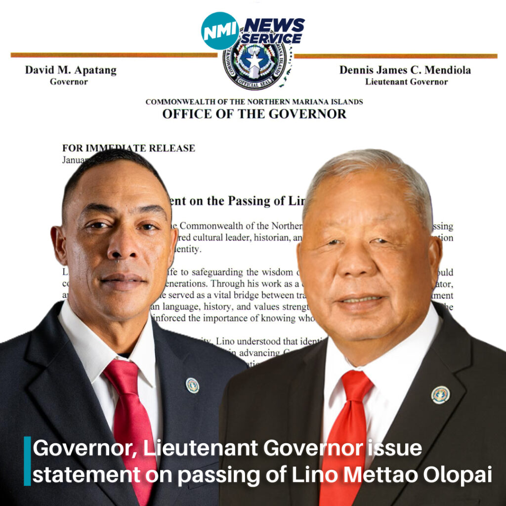 SAIPAN — Governor David M. Apatang and Lieutenant Governor Dennis James C. Mendiola issued a statement mourning the passing of Lino Mettao Olopai, describing him as a revered cultural leader, historian, and advocate for preserving Carolinian heritage and identity.