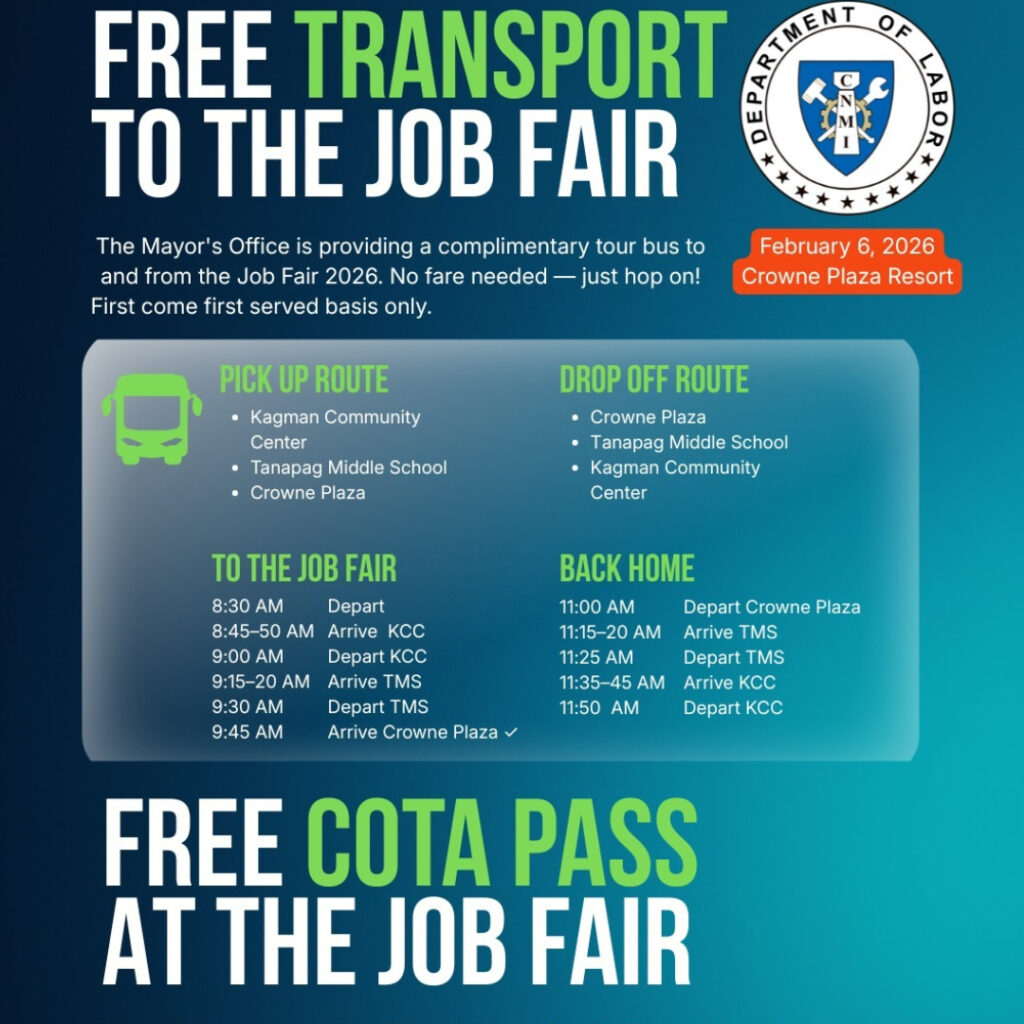 SAIPAN, CNMI — The CNMI Department of Labor’s Job Fair set for Feb. 6 from 9 a.m. to 3 p.m. at Crowne Plaza Resort is now adding a major boost for jobseekers: free bus transportation to the venue, plus free COTA passes while supplies last.