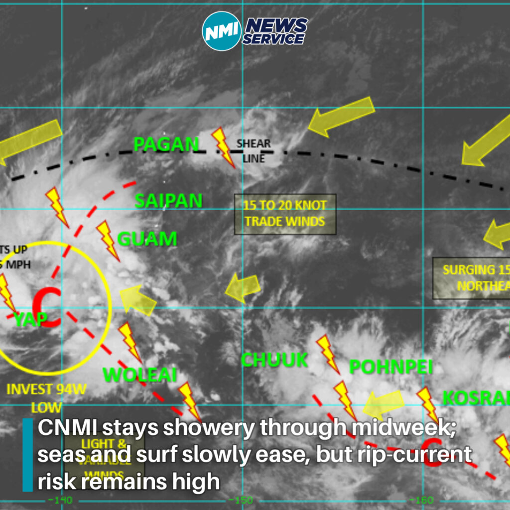 CNMI stays showery through midweek; seas and surf slowly ease, but rip-current risk remains high