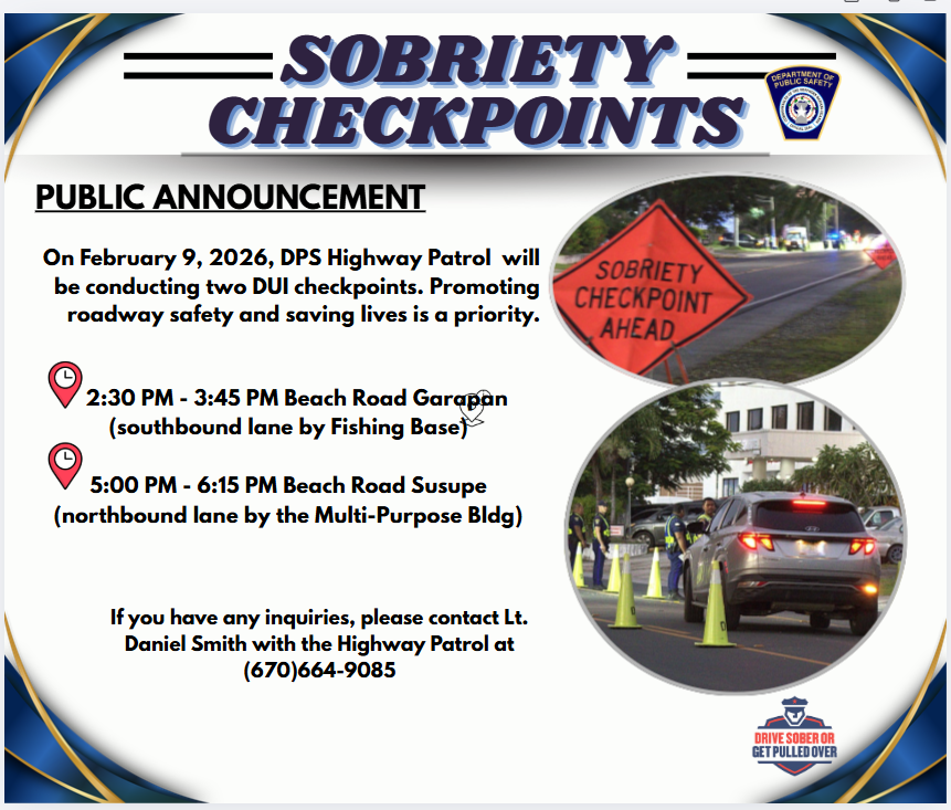 SAIPAN — While Super Bowl showdown between the Seattle Seahawks and New England Patriots will bring hundreds of football fans to Saipan’s homes of hydration, the Department of Public Safety Highway Patrol will conduct two DUI sobriety checkpoints on February 9 as part of its roadway-safety enforcement effort.