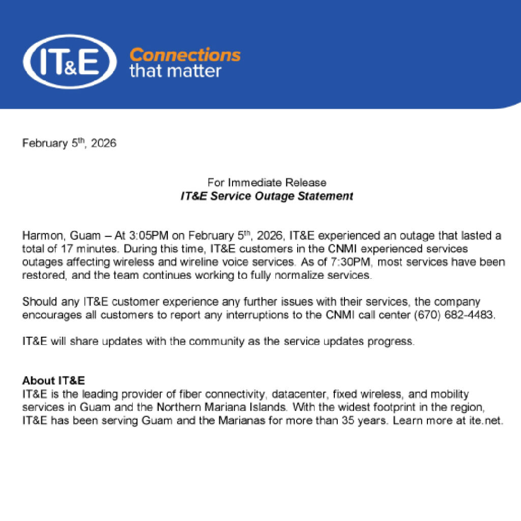 HARMON, Guam — IT&E said it experienced a service outage at 3:05 p.m. on Feb. 5 that lasted 17 minutes, affecting wireless and wireline voice services for customers in the CNMI.