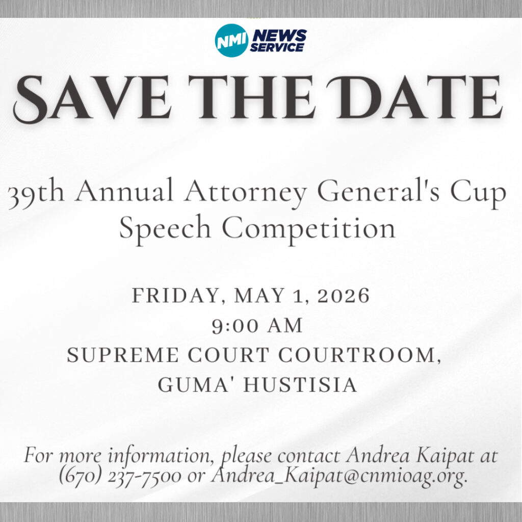 SAIPAN — Attorney General Edward Manibusan announced the CNMI’s 39th Annual Attorney General’s Cup speech competition will be held Friday, May 1, 2026, at 9:00 a.m. in the Guma Hustisia Supreme Court Courtroom.