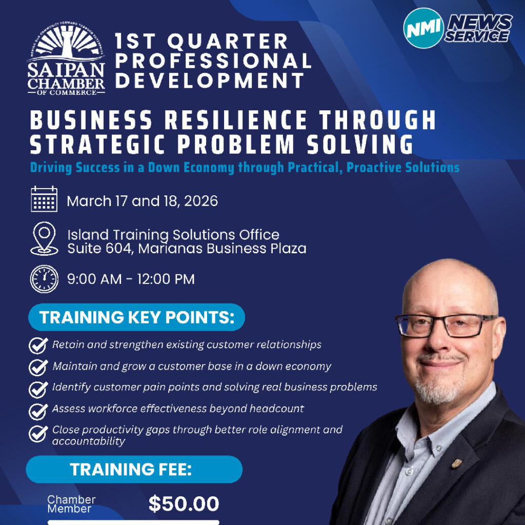 SAIPAN — With four weeks remaining before the first quarter professional development offering of the year, the Saipan Chamber of Commerce is reminding the business community to register for its upcoming training, “Business Resilience Through Strategic Problem Solving.”