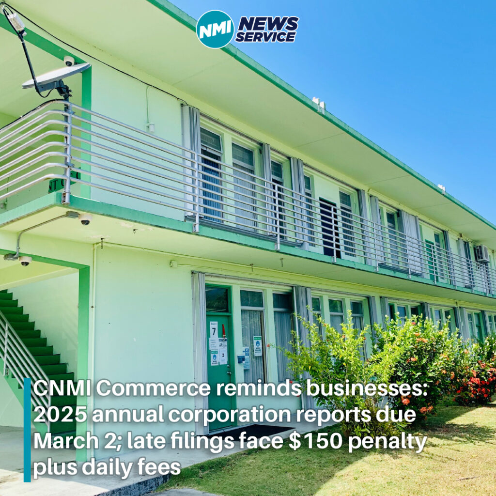 SAIPAN — The CNMI Department of Commerce, Office of the Secretary and Registrar of Corporations, is reminding business entities that 2025 Annual Corporation Reports are due Monday, March 2, with penalties in place for late submissions.