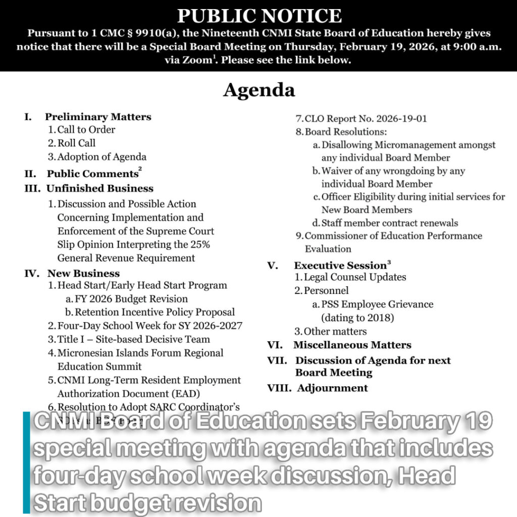 CNMI Board of Education sets February 19 special meeting with agenda that includes four-day school week discussion, Head Start budget revision