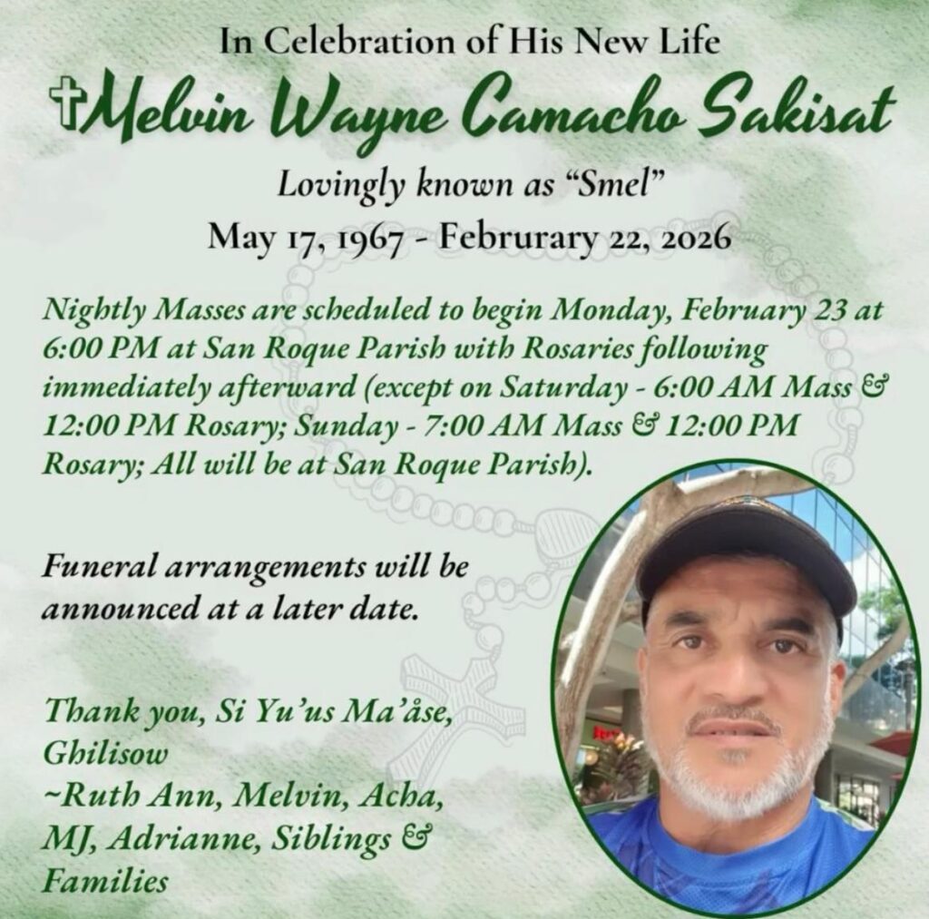 In celebration of his new life, the family of Melvin Wayne Camacho Sakisat, lovingly known as “Smel,” nightly Masses and rosaries will be held at San Roque Parish.
