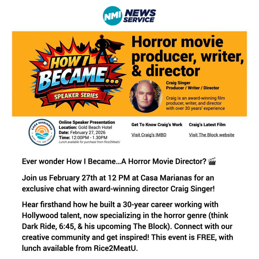SAIPAN — Casa Marianas is set to host the next installment of its “How I Became…” speaker series on February 27 featuring award-winning film producer, director, and writer Craig Singer.