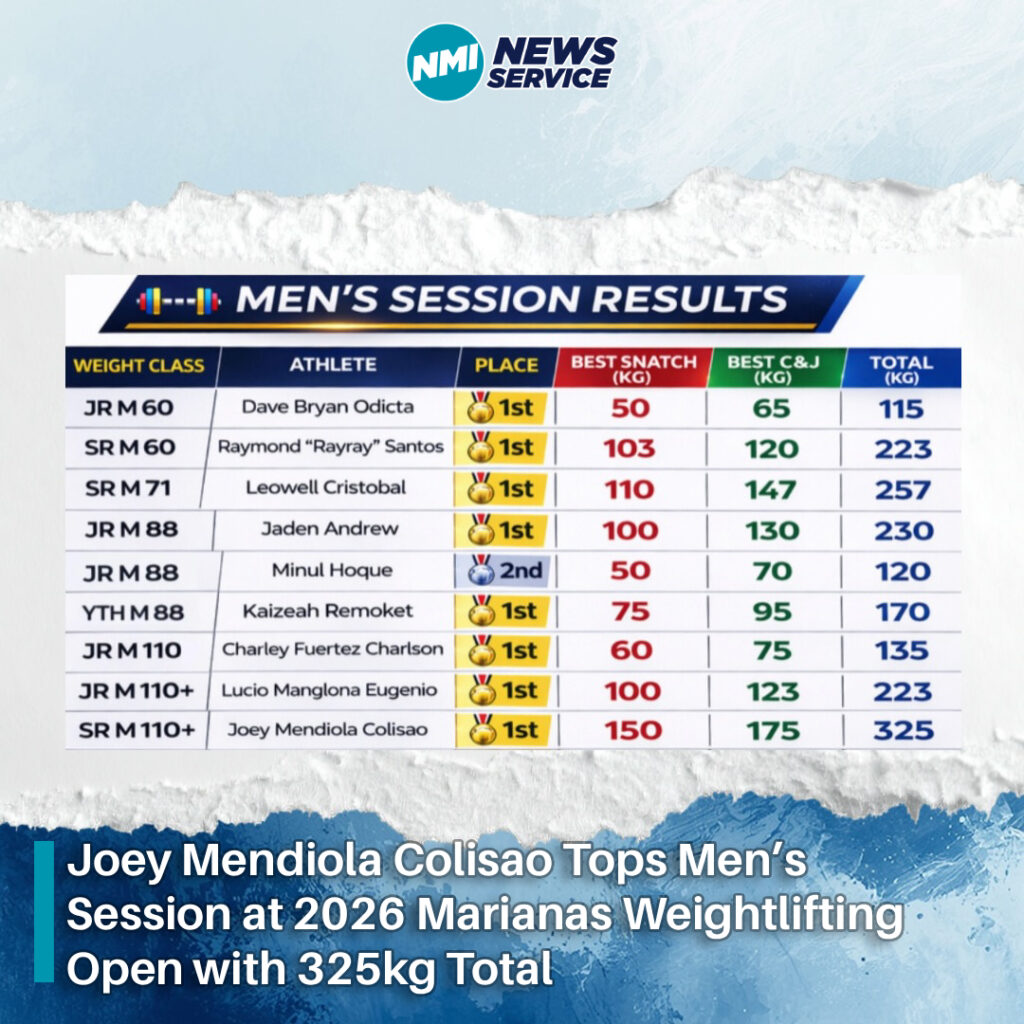 SAIPAN —Joey Mendiola Colisao continues to impress on the big stage as he posted the top total of the session at 325 kilograms in the 2026 Marianas Weightlifting Open, hosted by CNMI Weightlifting.