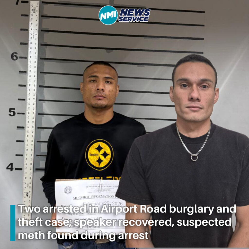 Saipan — Two men were arrested February 25 in connection with a January burglary and theft case after investigators linked them to stolen property shown in a video that we posted on the NMI News Service social media channels and later recovered a speaker the victim identified as stolen.