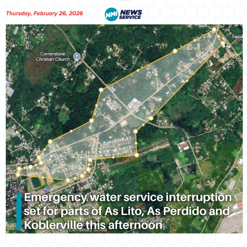 Saipan — The Commonwealth Utilities Corporation announced an emergency water service interruption today, Thursday, February 26, for portions of As Lito, As Perdido and Koblerville as crews work to repair a waterline leak.