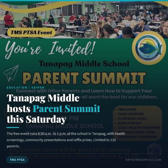 SAIPAN — Tanapag Middle School’s PTSA is hosting a Parent Summit this Saturday, March 7, from 8:30 a.m. to 1:00 p.m. at the school in Tanapag.