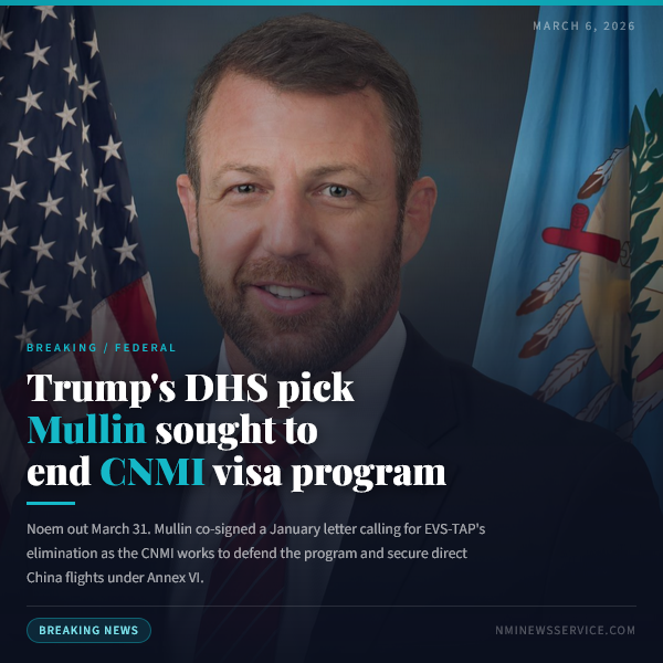 WASHINGTON — President Donald Trump announced Friday that DHS Secretary Kristi Noem will leave the Department of Homeland Security on March 31, 2026, replaced by Senator Markwayne Mullin of Oklahoma, one of the senators who earlier this year called on the administration to eliminate the CNMI’s visa program for Chinese tourists.