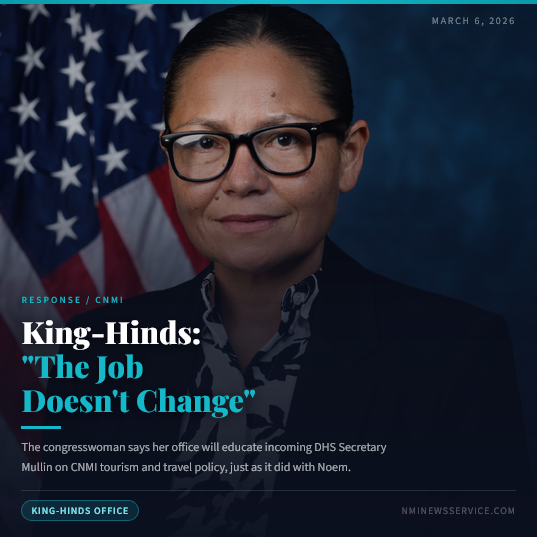 SAIPAN — Congresswoman Kimberlyn King-Hinds said Friday her office will work to educate incoming DHS Secretary Markwayne Mullin on the importance of the CNMI’s tourism and travel policies, the same approach it took with his predecessor.