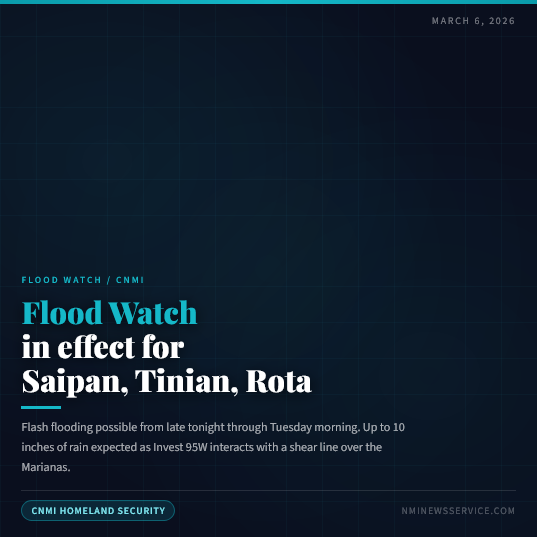 SAIPAN — The CNMI Homeland Security and Emergency Management office issued a Flood Watch Friday morning for Saipan, Tinian and Rota, warning residents that flash flooding remains possible from late tonight through Tuesday morning as a tropical disturbance interacts with a shear line over the Marianas.