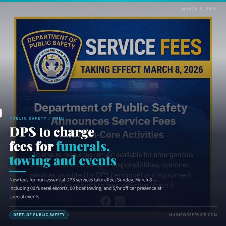 SAIPAN — The Department of Public Safety will begin charging fees for a range of services it considers outside its core law enforcement responsibilities beginning this Sunday, March 8, under authority granted by Public Law 14-77.