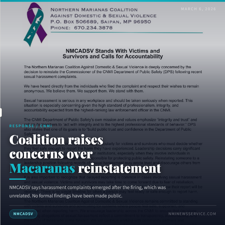 SAIPAN — The Northern Marianas Coalition Against Domestic and Sexual Violence issued a statement Friday expressing concern over the reinstatement of DPS Commissioner Anthony Macaranas, following sexual harassment complaints that emerged after he was removed from the position last month.