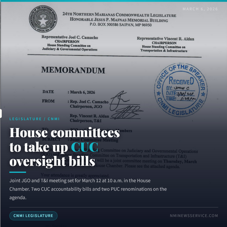 SAIPAN — Two House standing committees will meet jointly next Thursday to consider a pair of bills targeting the Commonwealth Utilities Corporation and to review the renominations of two Public Utilities Commission members.