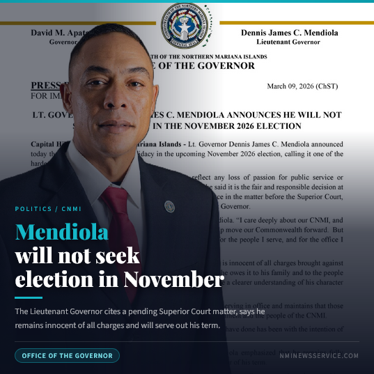 SAIPAN — Lieutenant Governor Dennis James C. Mendiola announced Monday that he will not seek any candidacy in the November 2026 election, citing the need to focus on defending himself in a matter pending before the Superior Court while continuing to fulfill his duties in office.