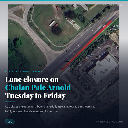SAIPAN — The Commonwealth Utilities Corporation will temporarily close the outer northbound lane on Chalan Pale Arnold in Puerto Rico from Tuesday, March 10 through Friday, March 13, to allow wastewater operators to access a manhole for sewer line cleaning and inspection.