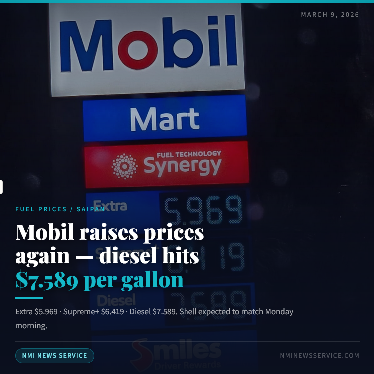 SAIPAN — Mobil raised fuel prices on Saipan again Sunday night, with gasoline grades climbing between 35 and 60 cents per gallon and diesel jumping $1.60 to $7.589, the highest price seen at the pump in recent memory.