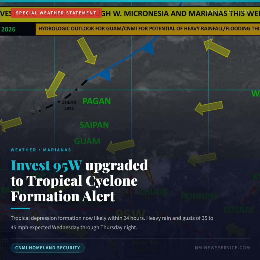 SAIPAN — The CNMI Homeland Security and Emergency Management office issued a Special Weather Statement Tuesday afternoon warning that Invest 95W has become better organized and is now under a Tropical Cyclone Formation Alert, meaning formation of a tropical depression is likely within the next 24 hours.