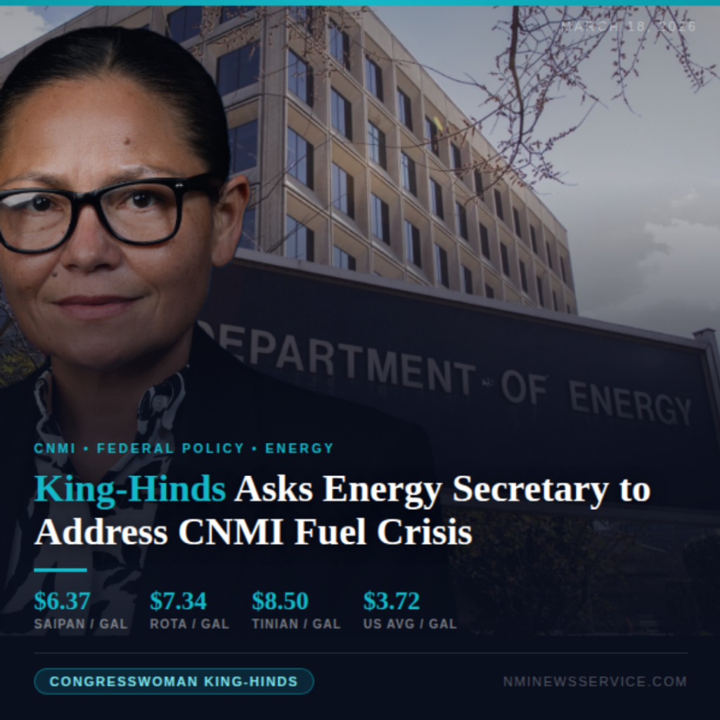 WASHINGTON — Congresswoman Kimberlyn King-Hinds has written to U.S. Energy Secretary Chris Wright asking the Department of Energy to work with her on solutions to fuel costs in the Commonwealth of the Northern Mariana Islands, where gasoline prices now range from $6.37 per gallon on Saipan to $7.34 and $8.50 per gallon on Rota and Tinian.