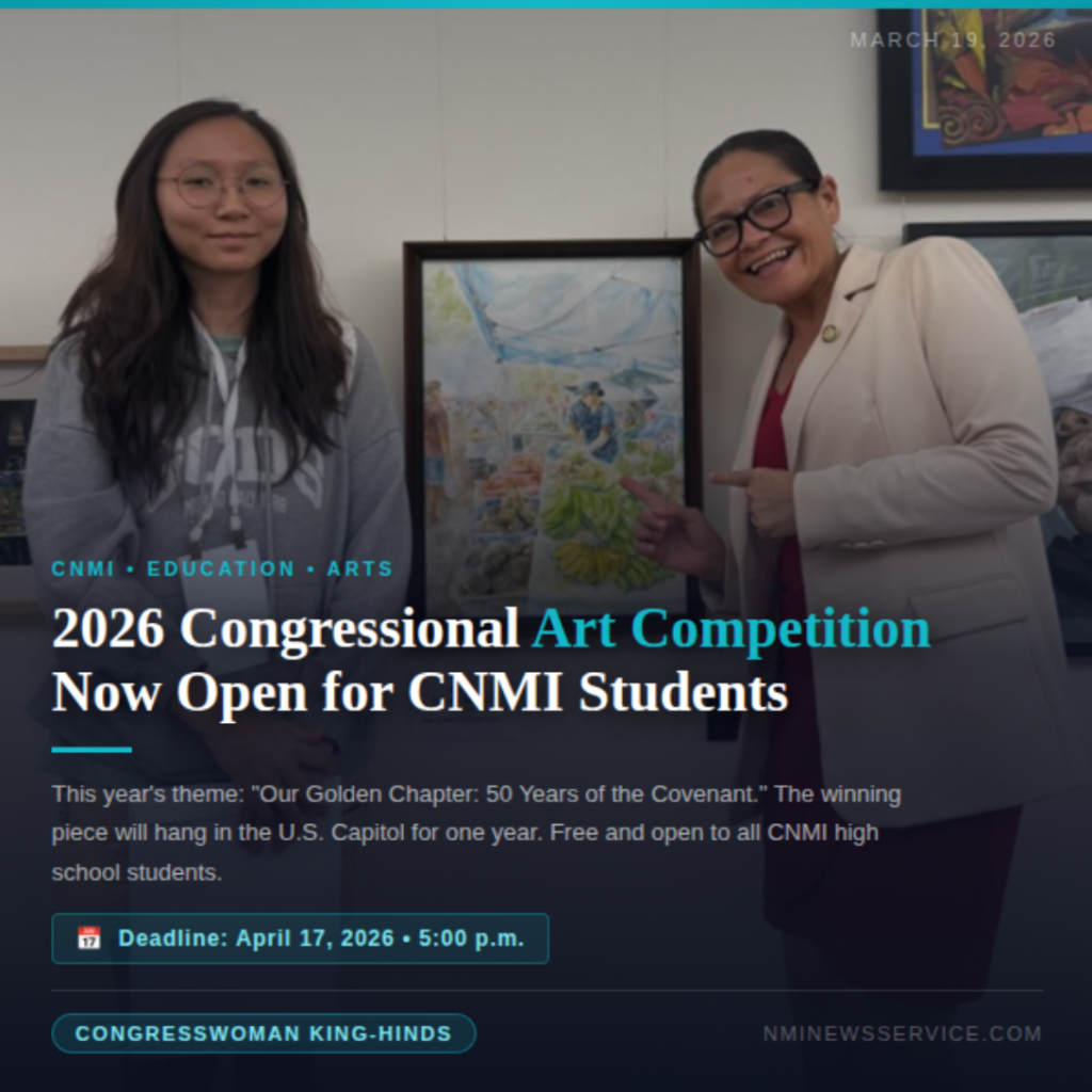 SAIPAN — Congresswoman Kimberlyn King-Hinds has announced the start of the 2026 Congressional Art Competition, inviting high school students across the Commonwealth to submit original artwork for a chance to have their piece displayed in the U.S. Capitol for one year.